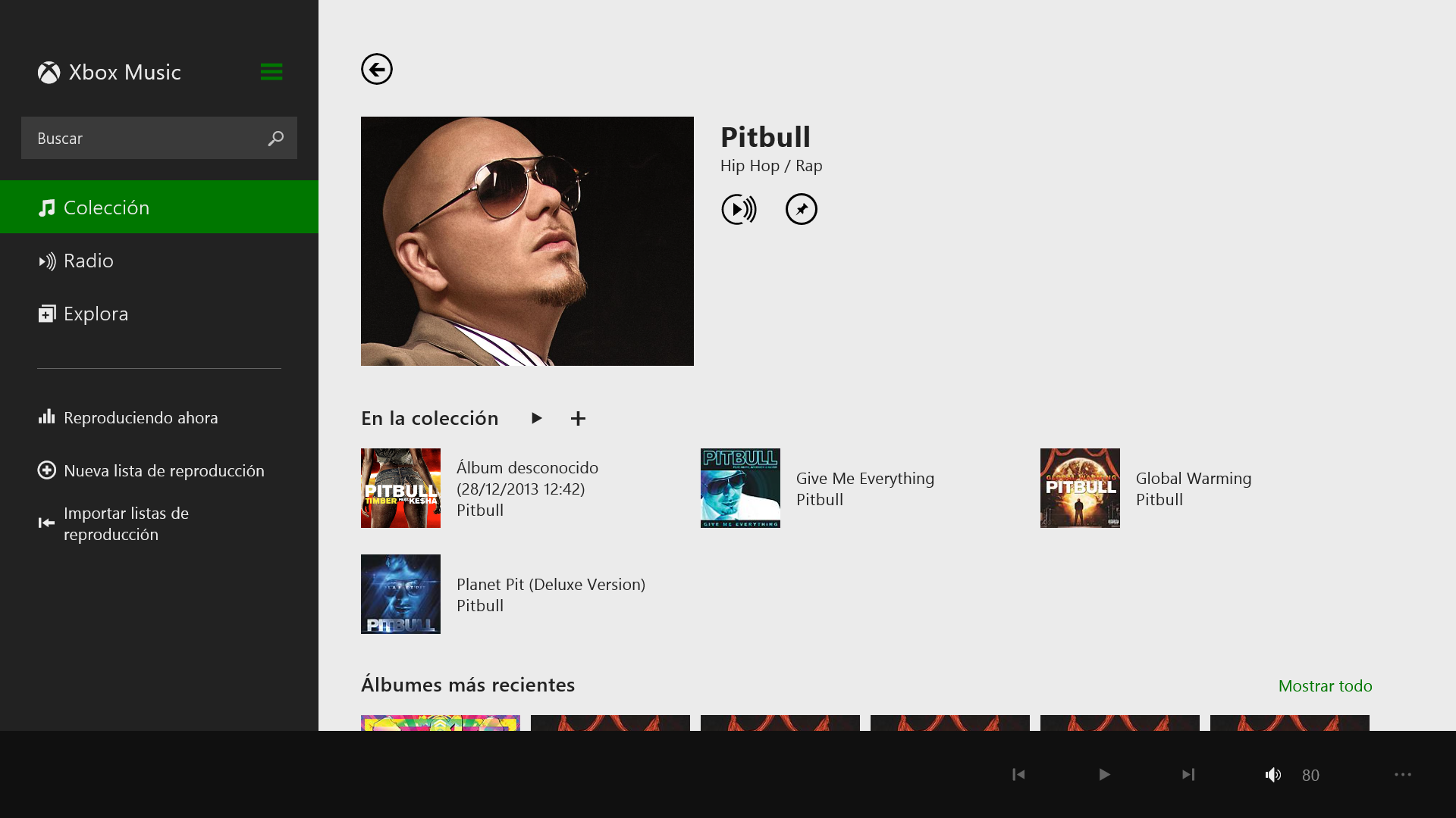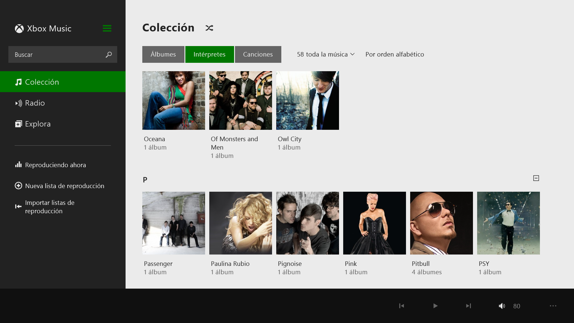 En el apartado ‘Colección’ Xbox Music muestra todas las canciones almacenadas en nuestro tablet organizadas por álbumes, intérpretes o canciones. Si seleccionamos intérpretes, por ejemplo, vemos la lista de cantantes y pulsando sobre uno de ellos aparecen todos los álbumes de los que tenemos alguna canción en nuestro tablet.