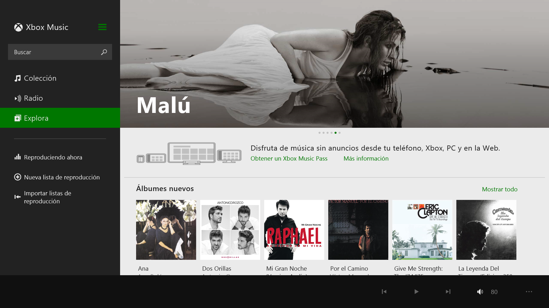 El Surface Pro 2 trae por defecto la aplicación Xbox Music para gestionar las necesidades musicales. La aplicación permite reproducir canciones almacenadas en el tablet así como acceder a un amplio conjunto de servicios online. Al abrir la aplicación encontramos varias secciones: Colección, Radio y Explora.