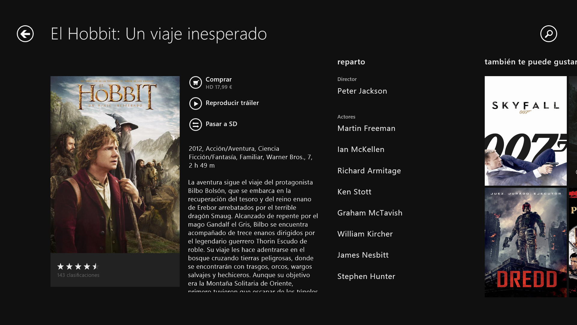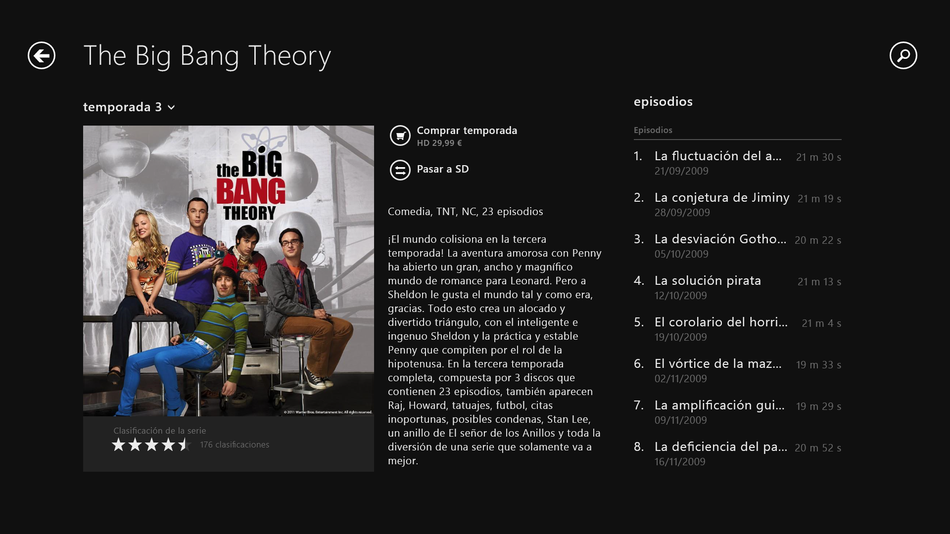 Además de reproducir ficheros locales Xbox Video ofrece, como comentábamos anteriormente, la reproducción de contenidos de vídeo a través de Internet. Un estreno como El Hobbit puede comprarse en HD por 18 € y en SD or 15 €. Una temporada completa de una serie como The Big Bang Theory cuesta 30 € en HD o SD.
