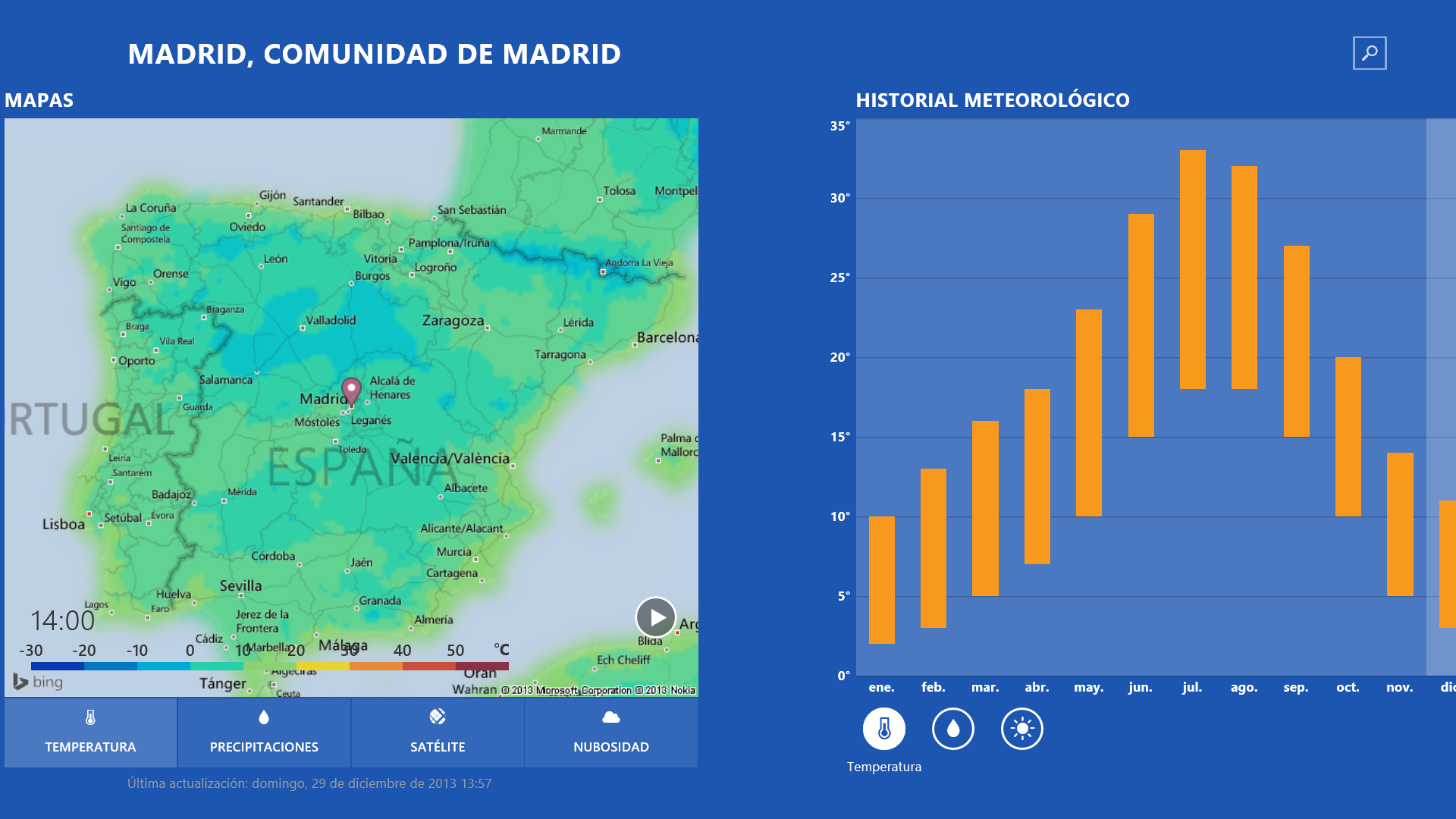 La aplicación El tiempo es una de las más completas que hemos visto. Muestra la previsión meteorológica para una o varias ubicaciones a varios días vista y hora a hora. Ofrece mapas de temperatura, precipitaciones, nubosidad y vía satélite, así como un historial meteorológico de temperatura, lluvia y sol. También muestra información sobre las estaciones de esquí. En la baldosa de la pantalla de Inicio se muestra la previsión meteorológica de nuestra ciudad.