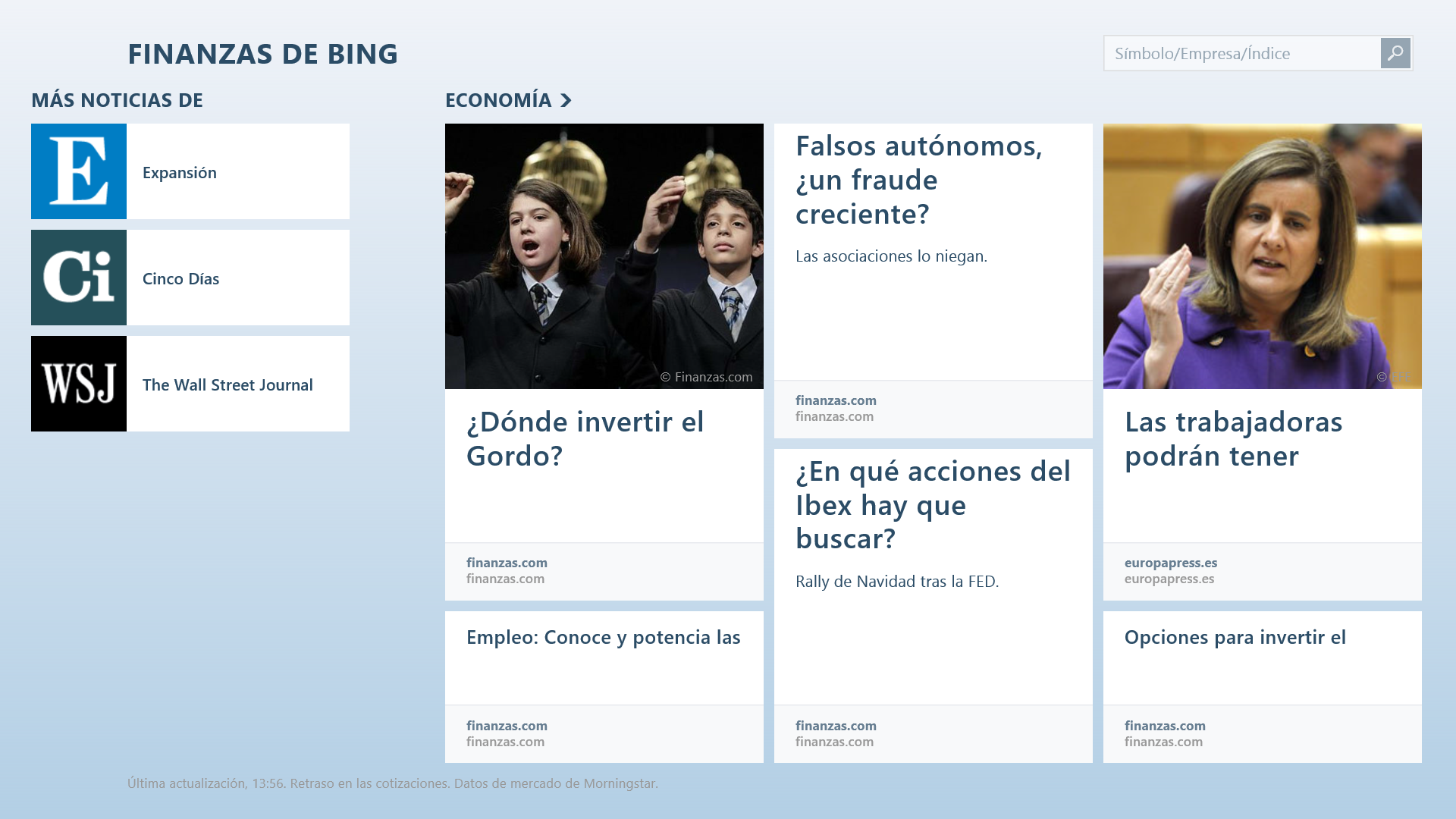 La aplicación Finanzas ofrece noticias sobre economía y permite acceder a la cotización de la Bolsa, el Mercado de Divisas, el Mercado de Materias Primas y otras informaciones relevantes.