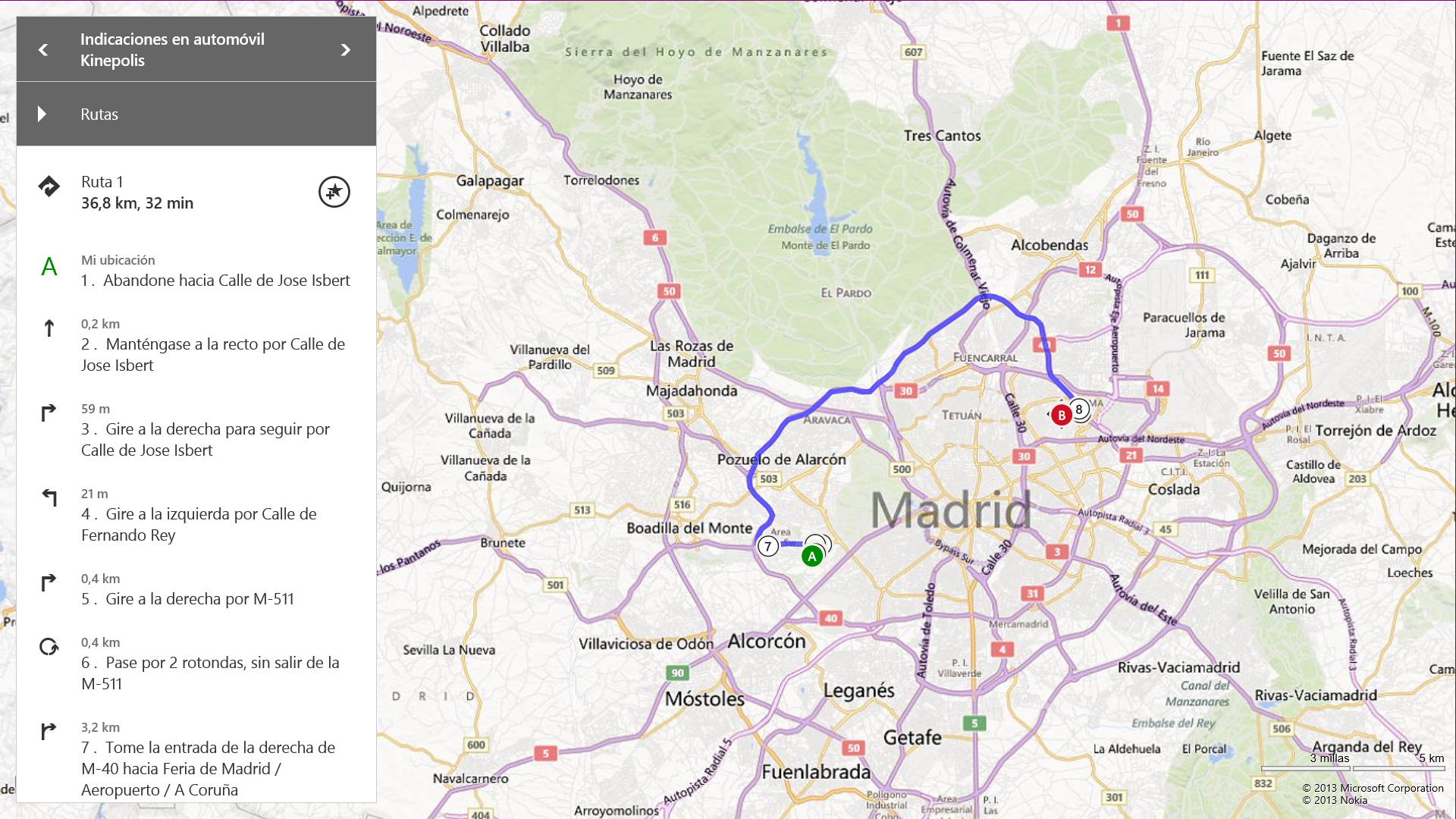 La aplicación Mapas muestra los mapas de Bing, que ofrecen dos modos de visualización: vista de carreteras o vista aérea. Esta última no es la habitual vista de satélite que ofrece Google sino un vista de pájaro que permite ver los edificios con una inclinación de unos 45º. La aplicación ofrece información de tráfico y permite calcular rutas en coche o a pie entre dos puntos.