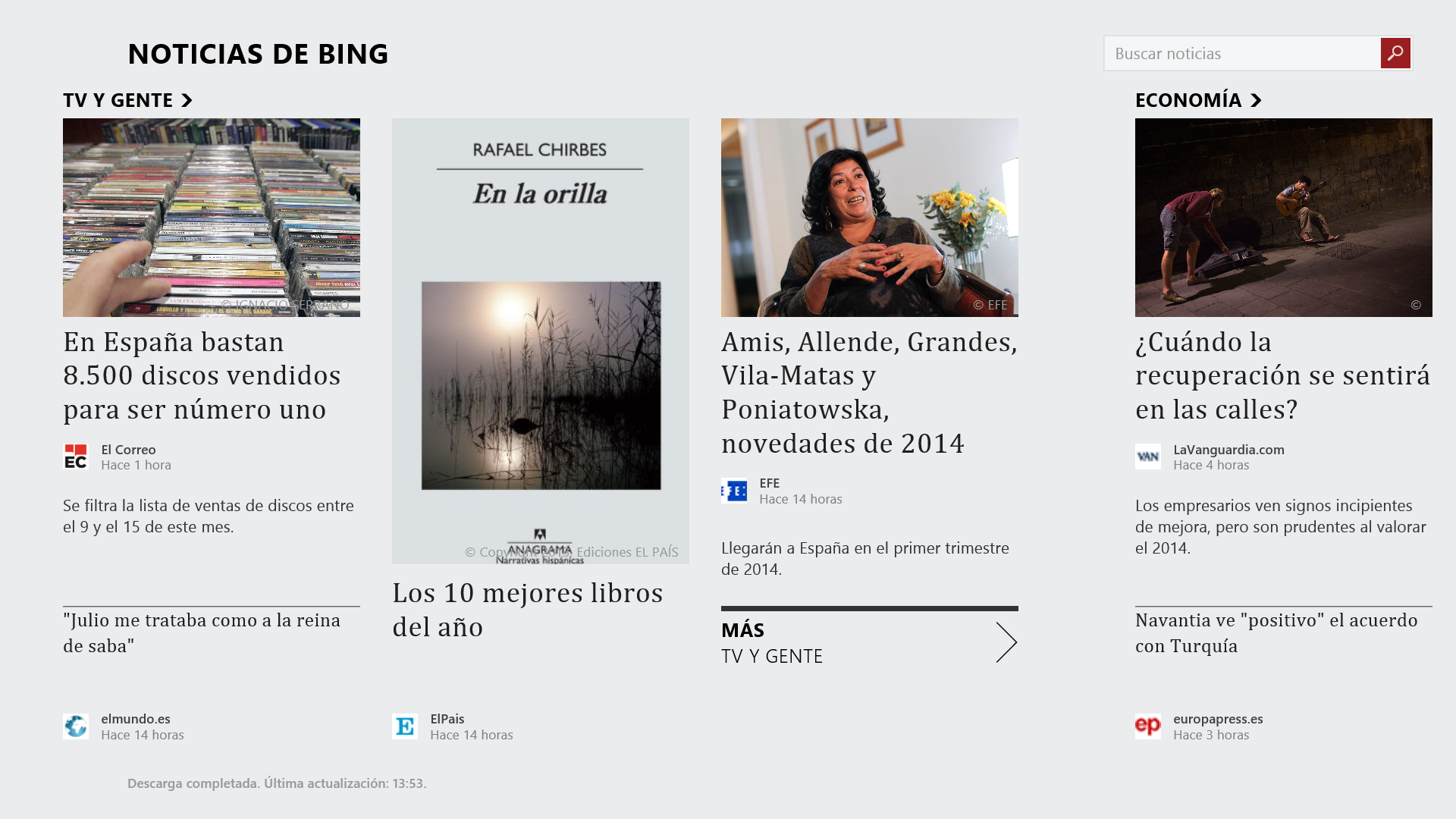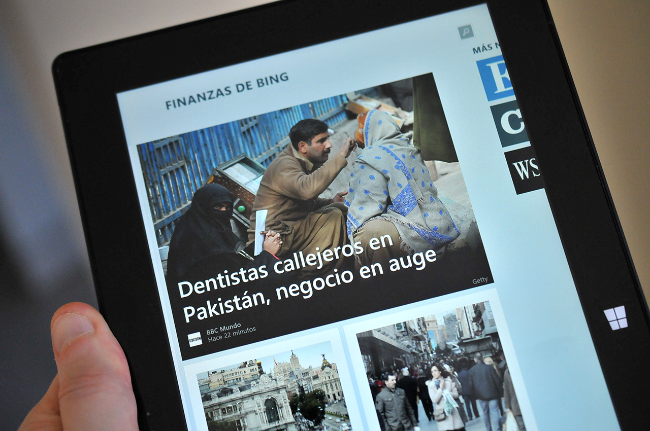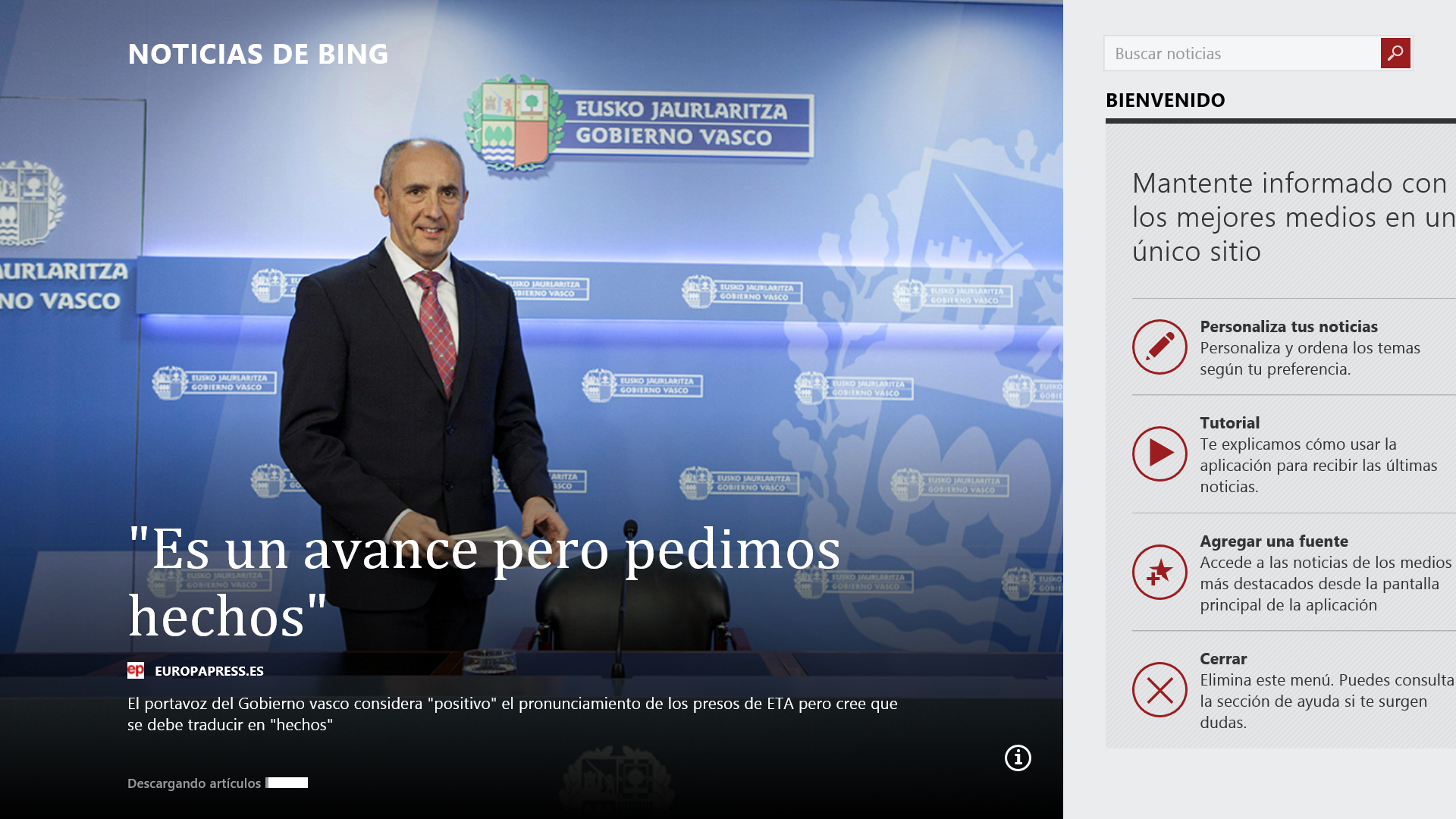 La aplicación Noticias permite personalizar el tipo de noticias que queremos leer (Noticia Destacada, Titulares, España, Internacional, TV y Gente, Economía y Deportes), seleccionar las fuentes de noticias (El Mundo, El País, Reuters, 2o Minutos, La Información, Público, La Razón, ABC, As, Marca, etc.) e incluso añadir nuestras propias fuentes RSS. En la baldosa de la pantalla de Inicio se muestra siempre la noticia destacada.