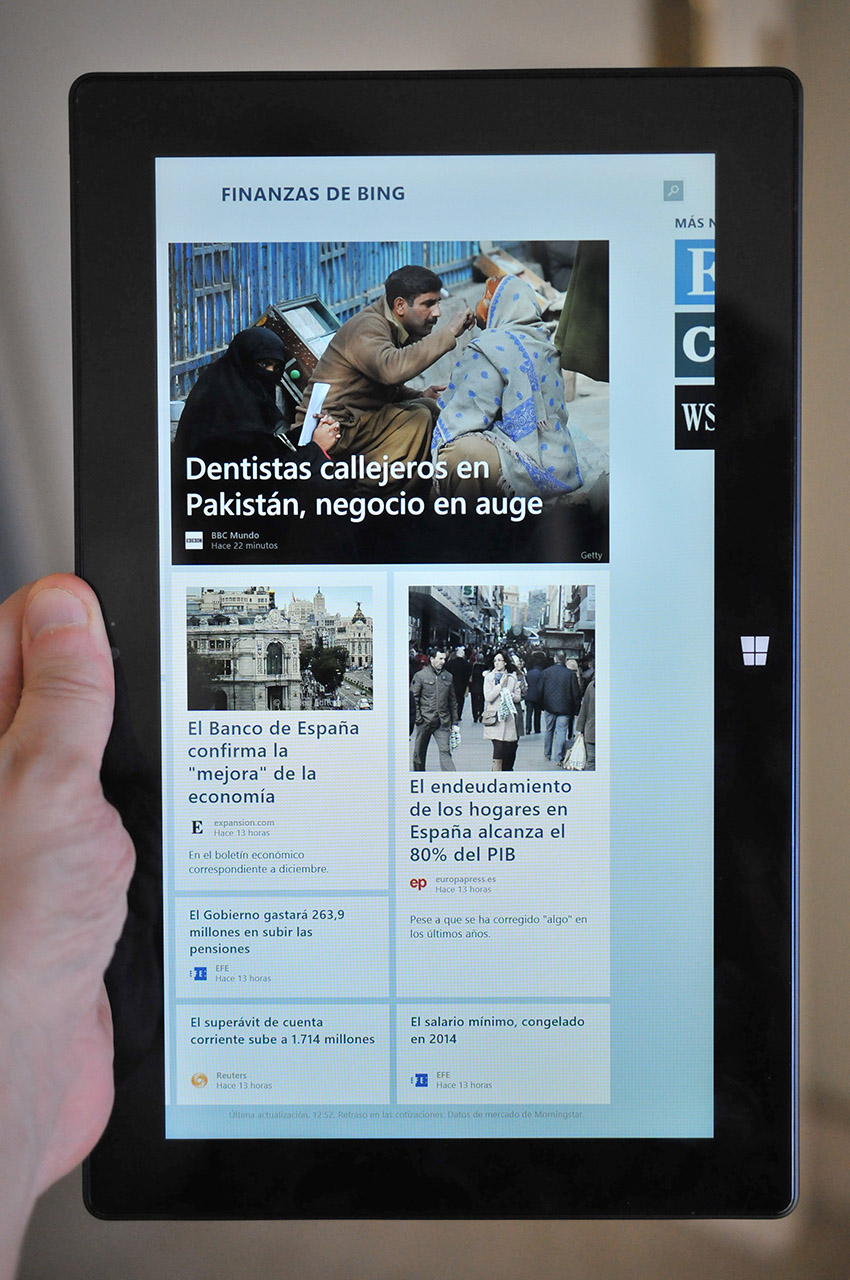 Así, por ejemplo, sostener en vertical el Surface Pro 2 para leer un libro electrónico o utilizar el navegador no acaba de ser demasiado cómodo. Además, dado que el botón de Windows está justo en el centro de uno de los lados largos, resulta inevitable pulsarlo inintencionadamente.