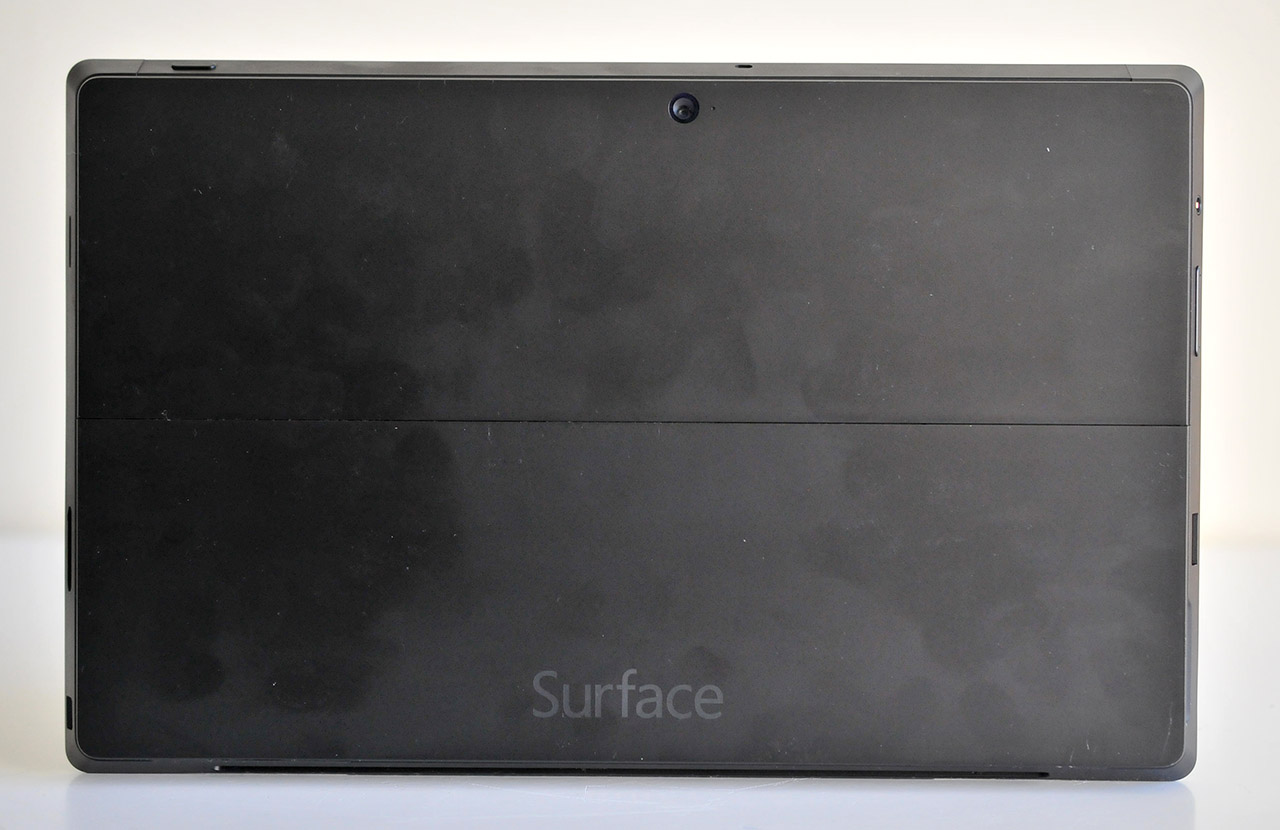 La parte trasera tan solo tiene una cámara y una base plegable de metal integrada que, al levantarla, deja al descubierto una inscripción con el modelo de Surface, la capacidad de almacenamiento y otras anotaciones. Como se puede apreciar en la foto, es bastante proclive a capturar huellas de los dedos.