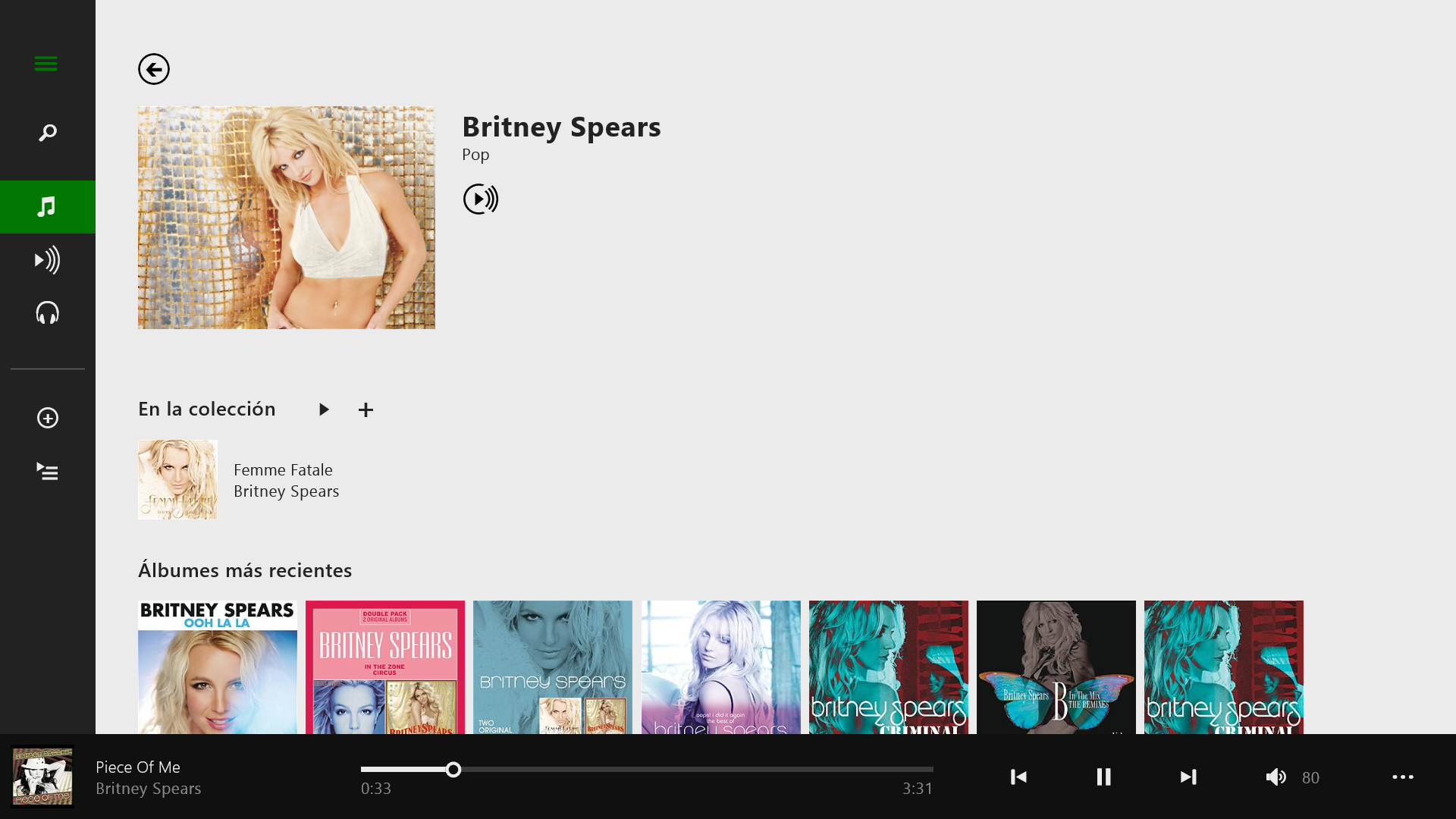 En el apartado ‘Colección’ Xbox Music muestra todas las canciones almacenadas en nuestro tablet organizada por álbumes, intérpretes o canciones. Si seleccionamos intérpretes, por ejemplo, vemos la lista de cantantes y pulsando sobre uno de ellos aparecen todos los álbumes de los que tenemos alguna canción en nuestro tablet.