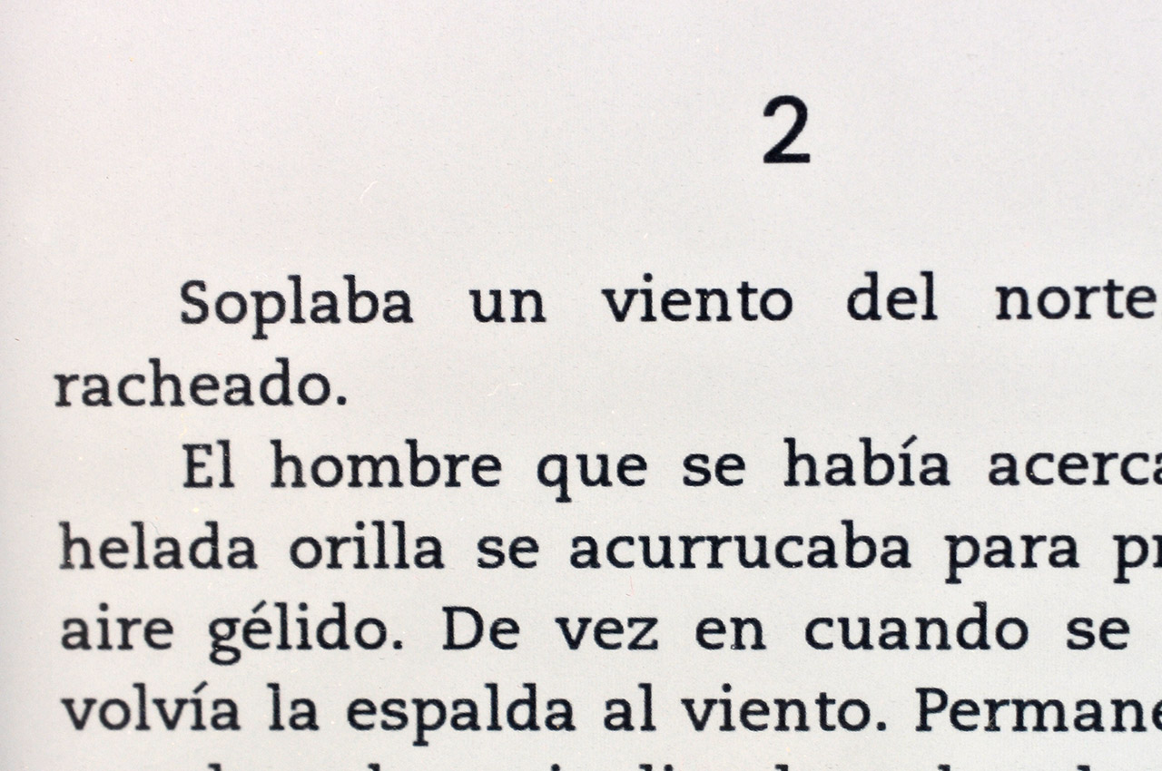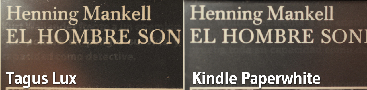 Este problema es más acusado cuando escogemos una fuente pequeña, como la que viene configurada por defecto en el lector, pero es poco visible si la fuente es de mayor tamaño. Lamentablemente ninguna de las fuentes seleccionables en el Tagus Lux tiene estilo negrita, que también minimizaría este problema, tal y como podemos apreciar en la siguiente comparativa con el Kindle Paperwhite, cuya fuente por defecto es más gruesa.