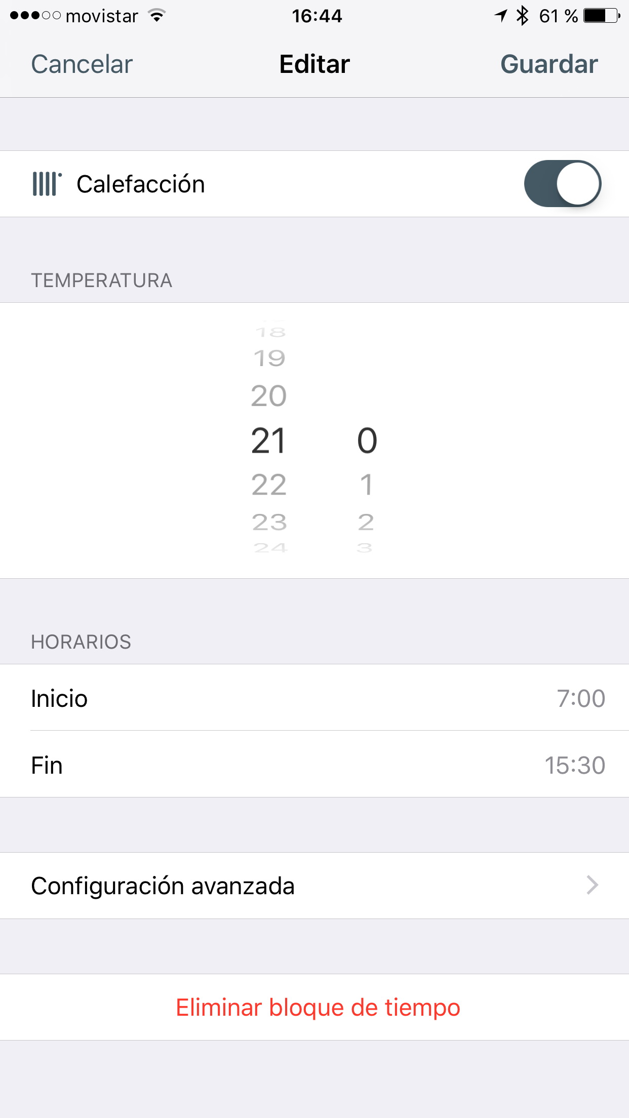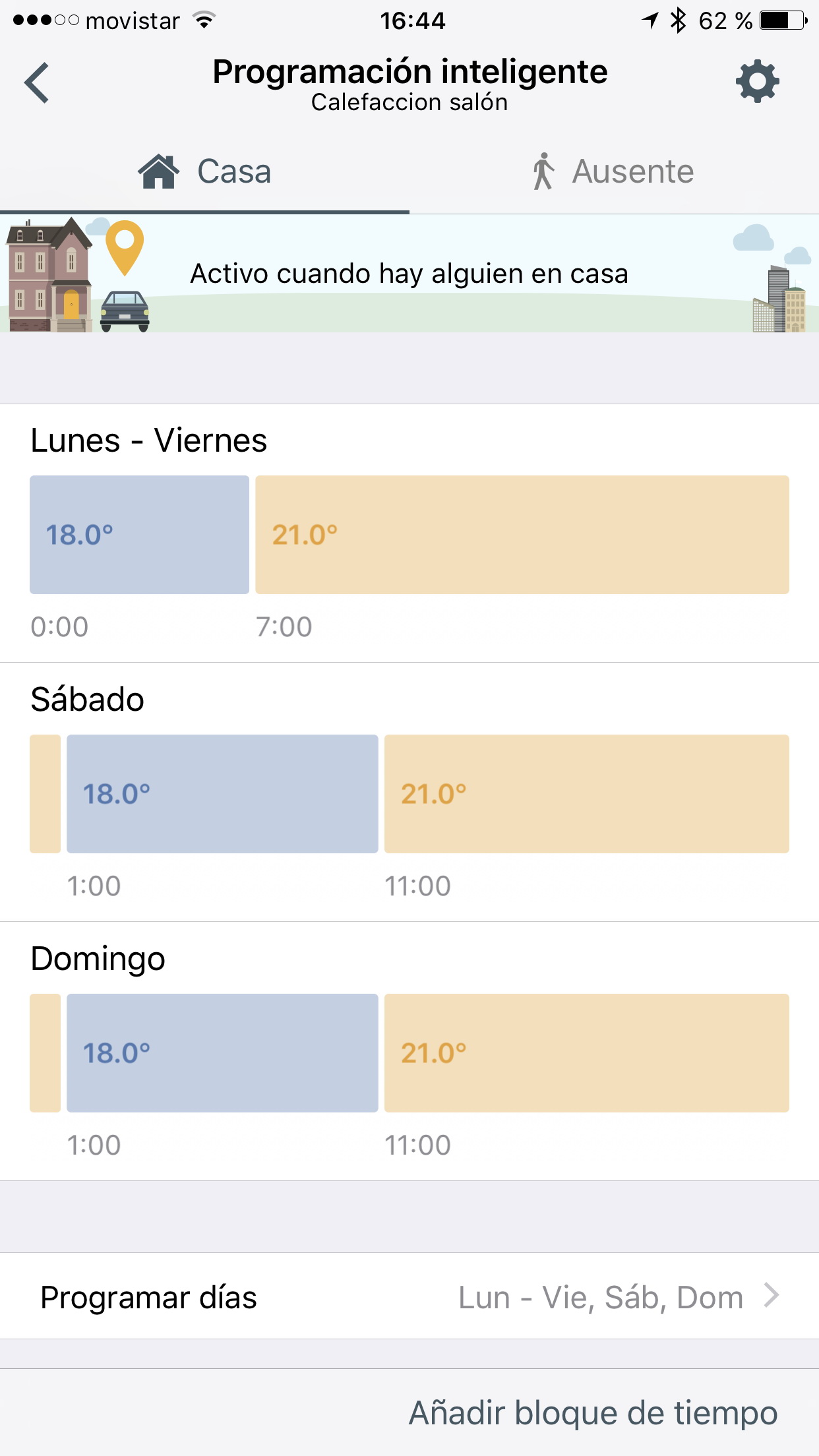 El primer paso en la configuración del termostato es la configuración del tramo horario en el que estamos durmiendo cada día de la semana, para fijar dos temperaturas objetivo: una cuando estamos en casa despiertos (21ºC en mi casa) y otra cuando estamos dormidos (18ºC en mi casa).