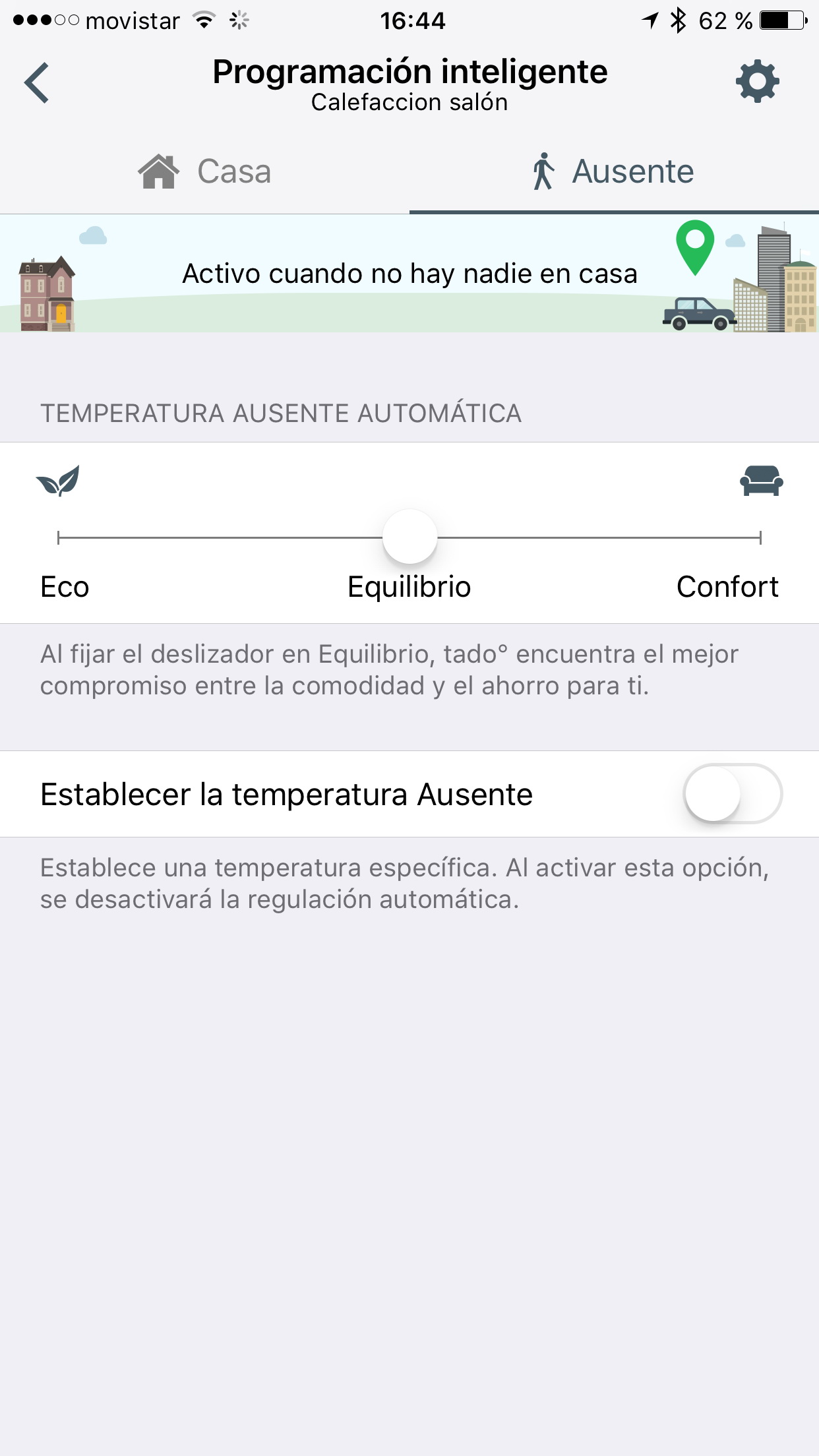 Por ejemplo, el termostato ha fijado que la temperatura objetivo cuando no estoy en casa es de 18.4ºC. Cuando salgo de casa por las mañanas (o en cualquier otro momento del día) la calefacción deja de funcionar mientras la casa está por encima de dicha temperatura.