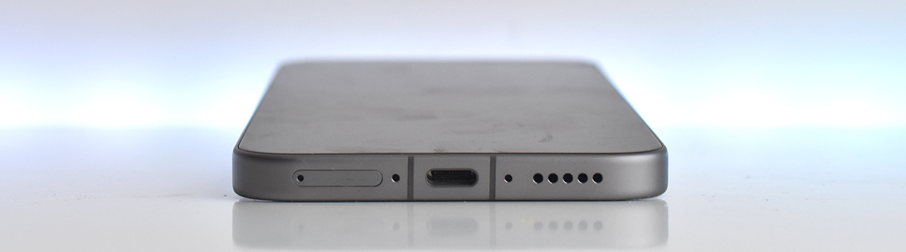 La parte inferior del teléfono posee el conector USB Tipo-C, el altavoz y el compartimento para la tarjeta nano-SIM.