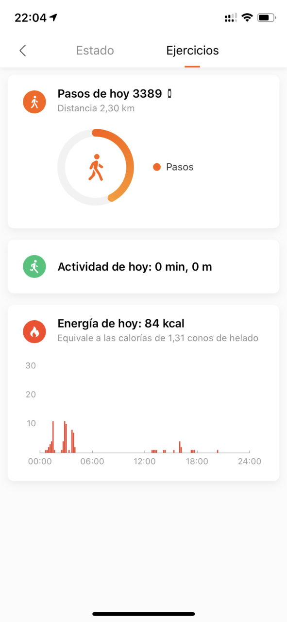 Si pulsas sobre el botón Ver más aparecen tarjetas con información más detallada sobre tu estado (evolución por horas de tu nivel de estrés, el sueño de la última noche, la evolución del ritmo cardíaco, etc.) y ejercicios (pasos caminados, energía consumida, actividad física, etc). Desde la app, también podemos iniciar actividades como caminar, correr o ciclismo si no queremos hacerlo desde la pulsera.