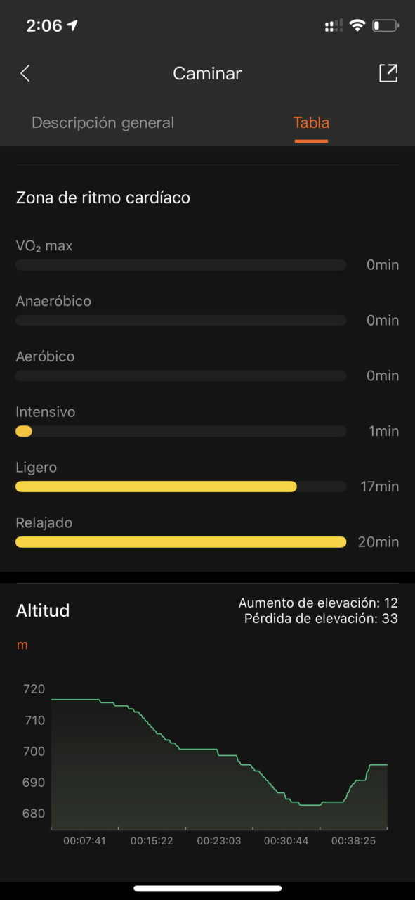 El apartado Ritmo cardíaco muestra nuestros latidos por segundo y, si arrastramos hacia abajo, podemos acceder a los valores máximos/mínimos y un porcentaje del tiempo que hemos pasado en modo relajado, ligero, intenso, aeróbico, anaeróbico, y VO2 max.