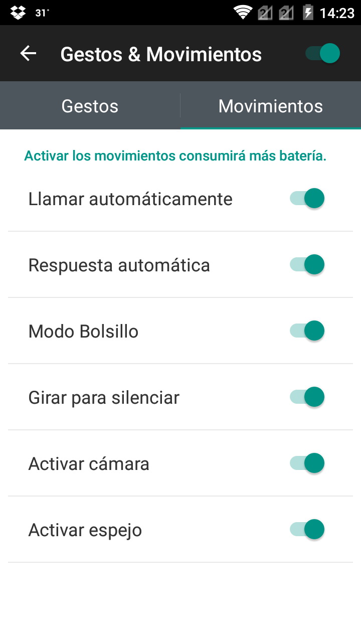 Entre los gestos disponibles está el de cubrir la pantalla del teléfono, agitar el terminal, acercarse el teléfono a la oreja, etc. y cada uno de ellos activa una función diferente.