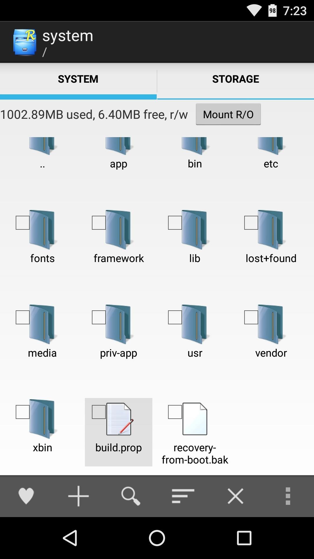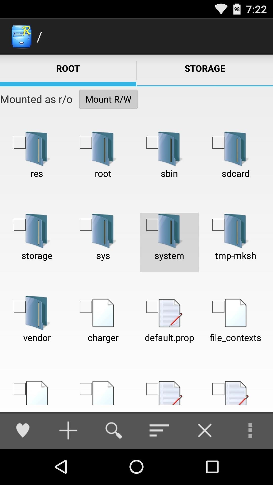 Abre tu navegador de ficheros favorito con capacidad de editar ficheros, navega hasta la partición root de tu dispositivo (la carpeta de más arriba en el árbol de carpetas), abre la carpeta system, y asegúrate de montarla como «lectura/escritura» («read/write») para poder hacer cambios a los ficheros de su interior.