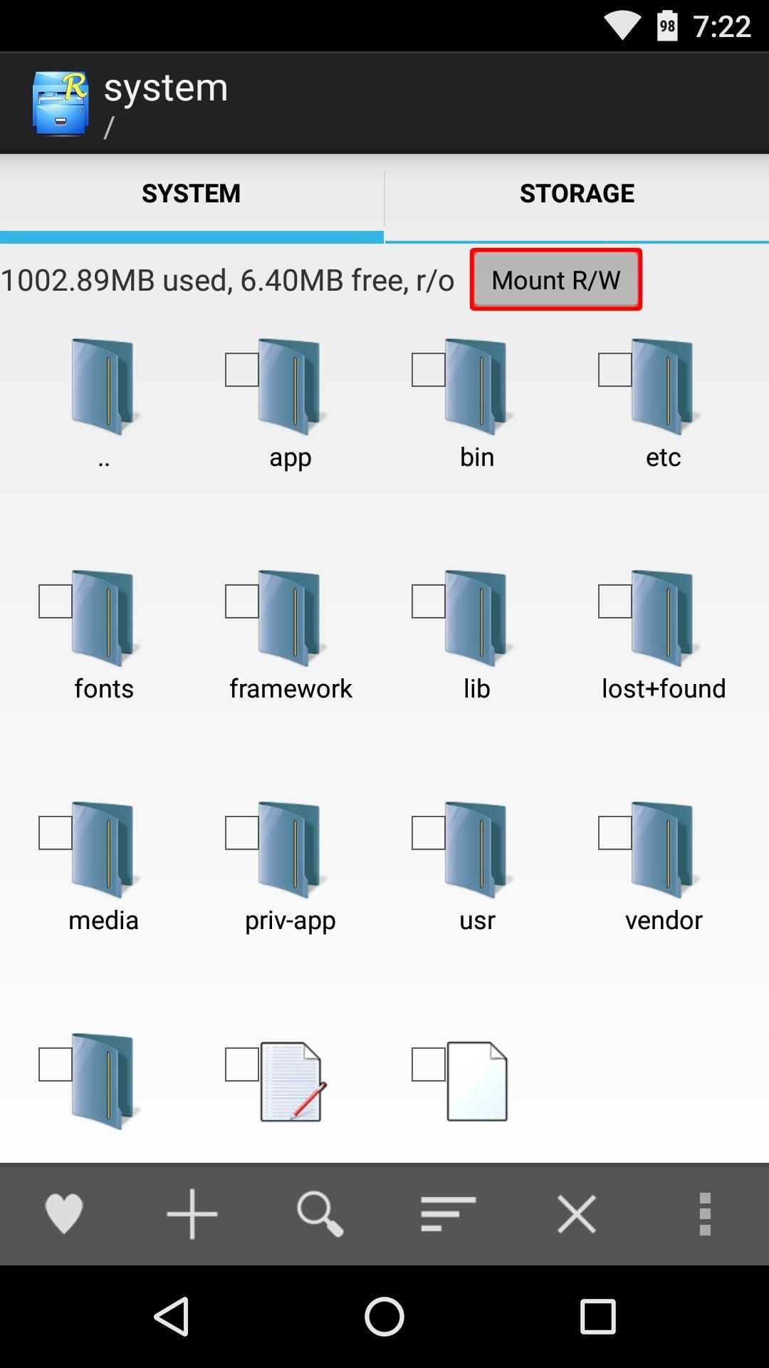 Abre tu navegador de ficheros favorito con capacidad de editar ficheros, navega hasta la partición root de tu dispositivo (la carpeta de más arriba en el árbol de carpetas), abre la carpeta system, y asegúrate de montarla como «lectura/escritura» («read/write») para poder hacer cambios a los ficheros de su interior.