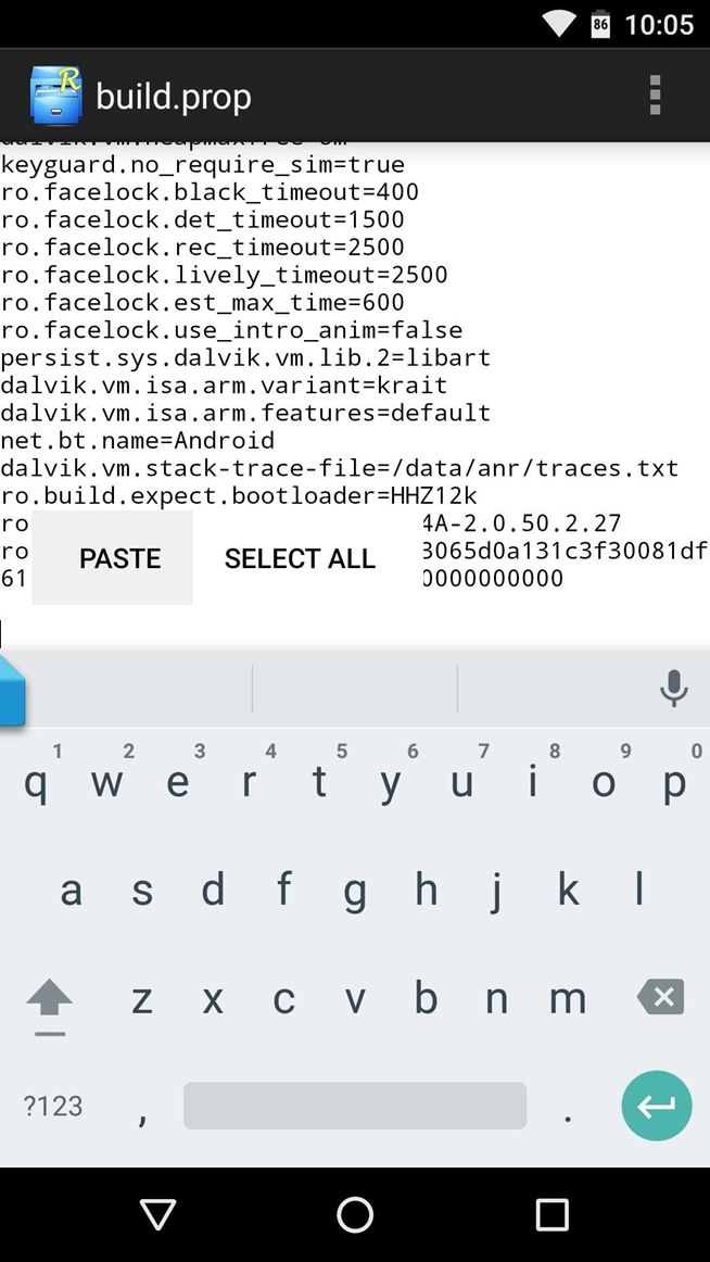 Una vez que tengas abierto el fichero en el editor, dirígete al final de la lista y pulsa Intro en el teclado para añadir una nueva línea. A continuación copia la siguiente línea de código, y pégala al final del contenido de tu fichero build.prop:
