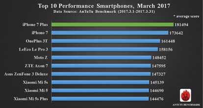 En el Top 10 de potencia absoluta, el primer y segundo lugar están ocupados por el iPhone 7 Plus y iPhone 7 con 181.494 y 173.642 puntos totales, respectivamente. A continuación encontramos varios teléfonos Android como el OnePlus 3T, el Leeco El Pro 3 y el Lenovo Moto Z.