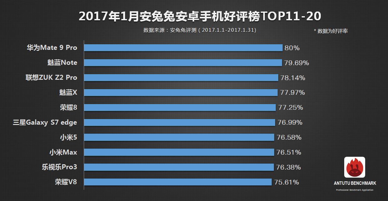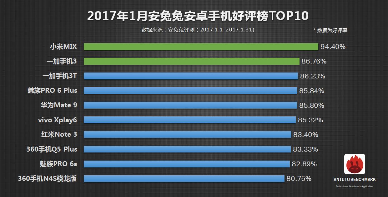 El Xiaomi Mi MIX tiene la mejor valoración con un 94,4%, mientras que el OnePlus 3 ocupa la segunda posición con 89,93%. El OnePlus 3T está en tercera posición, seguido de cerca por el Meizu Pro 6Plus y el Huawei Mate 9 en cuarta y quinta posición respectivamente.