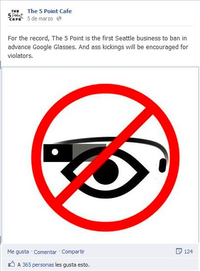 «Para que conste, The 5 Point es el primer establecimiento de Seattle que prohíbe por adelantado las Google Glasses. Y quienes no cumplan la prohibición, recibirán una patada en el culo.»