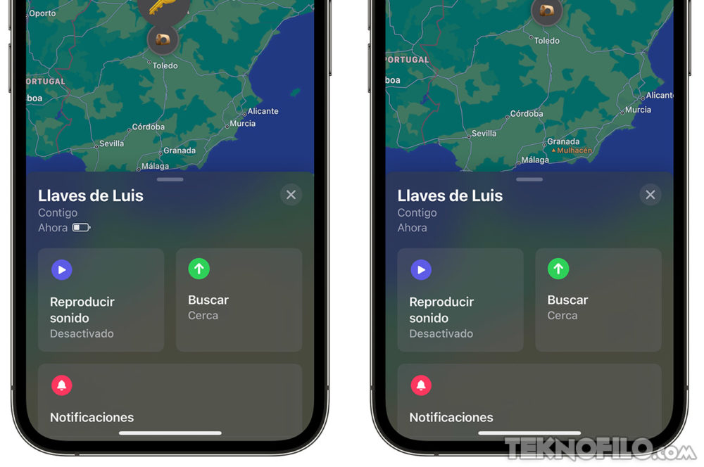 En versiones anteriores de iOS, cuando mirabas un AirTag en la app Buscar, aparecía un pequeño icono de batería junto al nombre y la ubicación.