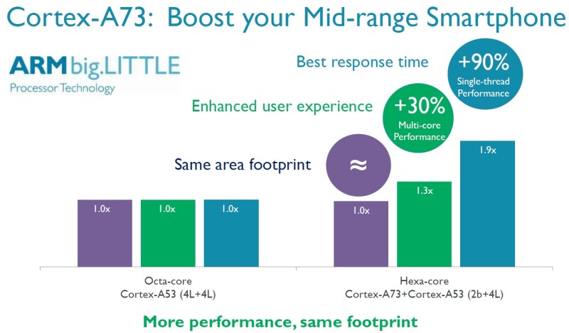 El cortex-A73 es un 30 por ciento más rápido que el A72, y ha sido construido a través de un proceso FinFET de 10nm. Esto permite al chip medir menos de 0.65 mm².