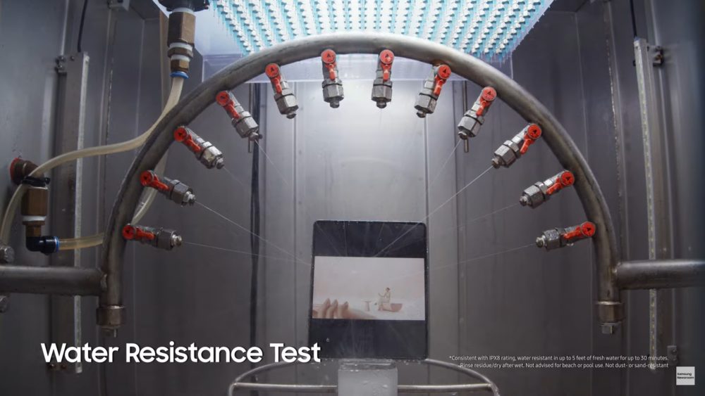 También se ve la prueba de durabilidad en la que Samsung comprueba la resistencia al agua de sus teléfonos, la frecuencia con la que se puede plegar y desplegar, y el buen funcionamiento de los botones laterales.