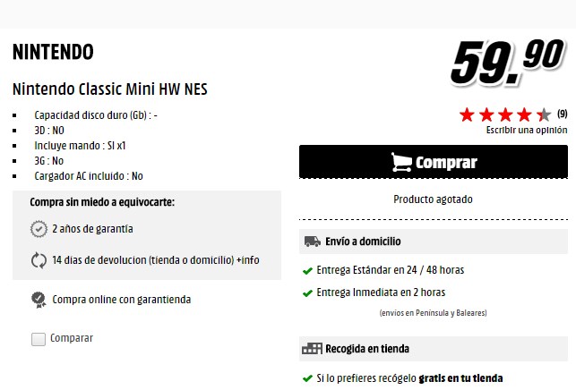 Nos acaban de soplar que, en este momento, hay unidades de la Nintendo Classic Mini en la tienda online Mediamarkt así que, si estás interesado, te recomendamos que corras a por ella. No sabemos por cuánto tiempo habrá unidades así que date prisa antes de que se agoten.