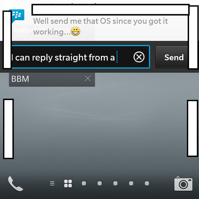 Esto es algo que solo es posible hasta cierto punto con la última versión de Android, y no es posible de ninguna forma con iOS o Windows Phone, este último el mayor competidor de BlackBerry en este momento. Además parece que será posible interactuar con las notificaciones de BlackBerry 10.2 directamente desde la pantalla de bloqueo.