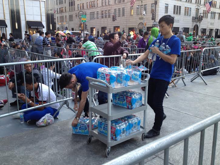 El operador T-Mobile ataviados con camisetas rosas también han puesto su granito de arena guardando sitios en la fila durante 15 minutos para permitir a la gente ir al baño, a cambio de que publicasen una foto con el hashtag #iPhone6Launch.
