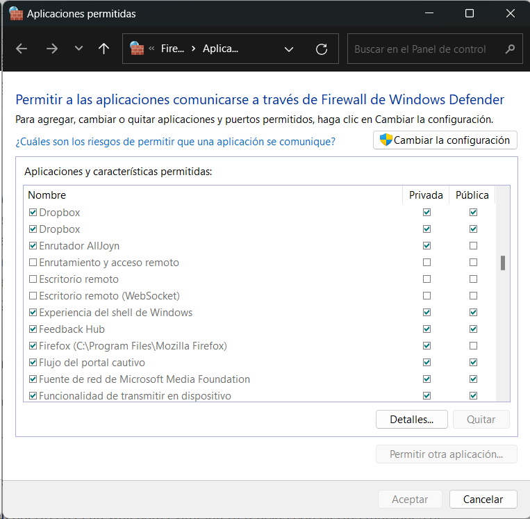 Para comprobar si el firewall está bloqueando una aplicación, puedes revisar su lista de aplicaciones permitidas. Esta lista muestra qué apps tienen acceso permitido o restringido en redes públicas (como Wi-Fi de cafeterías) y privadas (como el Wi-Fi de casa).