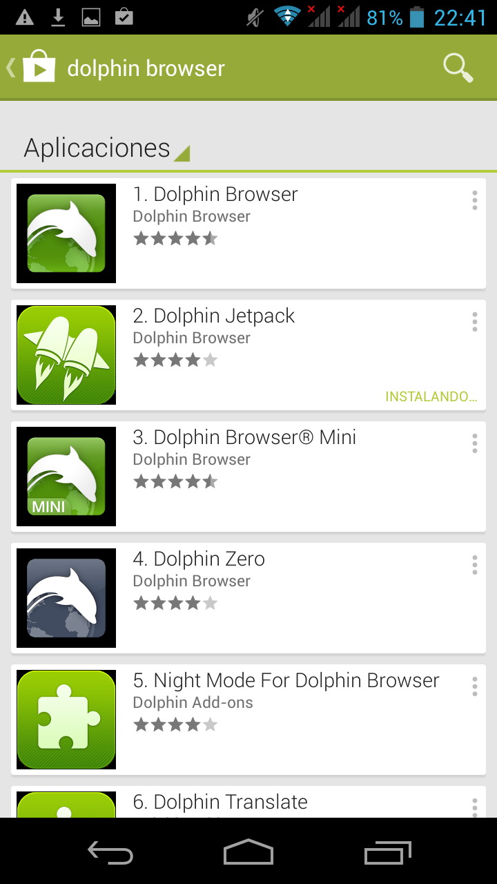 No necesitas descargarte por separado los ficheros APK de estas dos aplicaciones porque las puedes instalar de forma sencilla desde Google Play Store: Dolphin Browser y Dolphin JetPack.