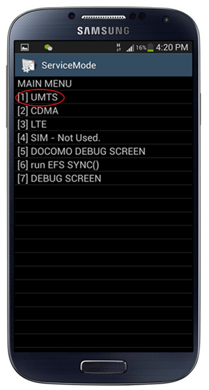 Paso 3: Pulsa Menú una vez más y de nuevo Atrás. Esto abrirá el Menú Principal del ServiceModel. Pulsa [1] UMTS.