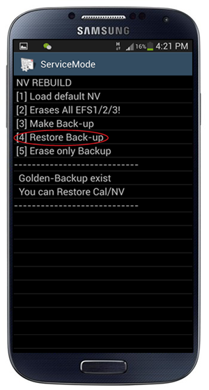 Paso 8: El teléfono te indicará que existe un Golden Backup exists. Pulsa [4] Restore Back-up.