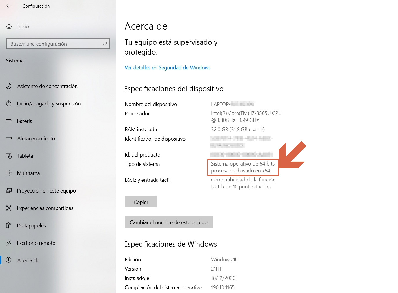 2) En la ventana que se abre, comprueba la entrada «Tipo de sistema».