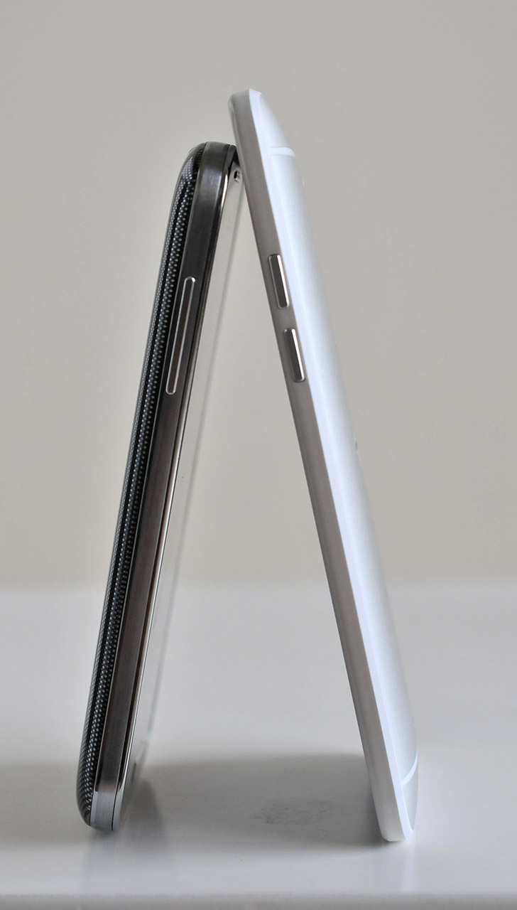 Dado que la mayor parte del tiempo el teléfono se encuentra apoyado boca arriba, no creemos que sea buena idea incluir el altavoz en la parte de atrás, como hace el Galaxy S4 Mini, ya que el sonido se amortigua y distorsiona con facilidad.