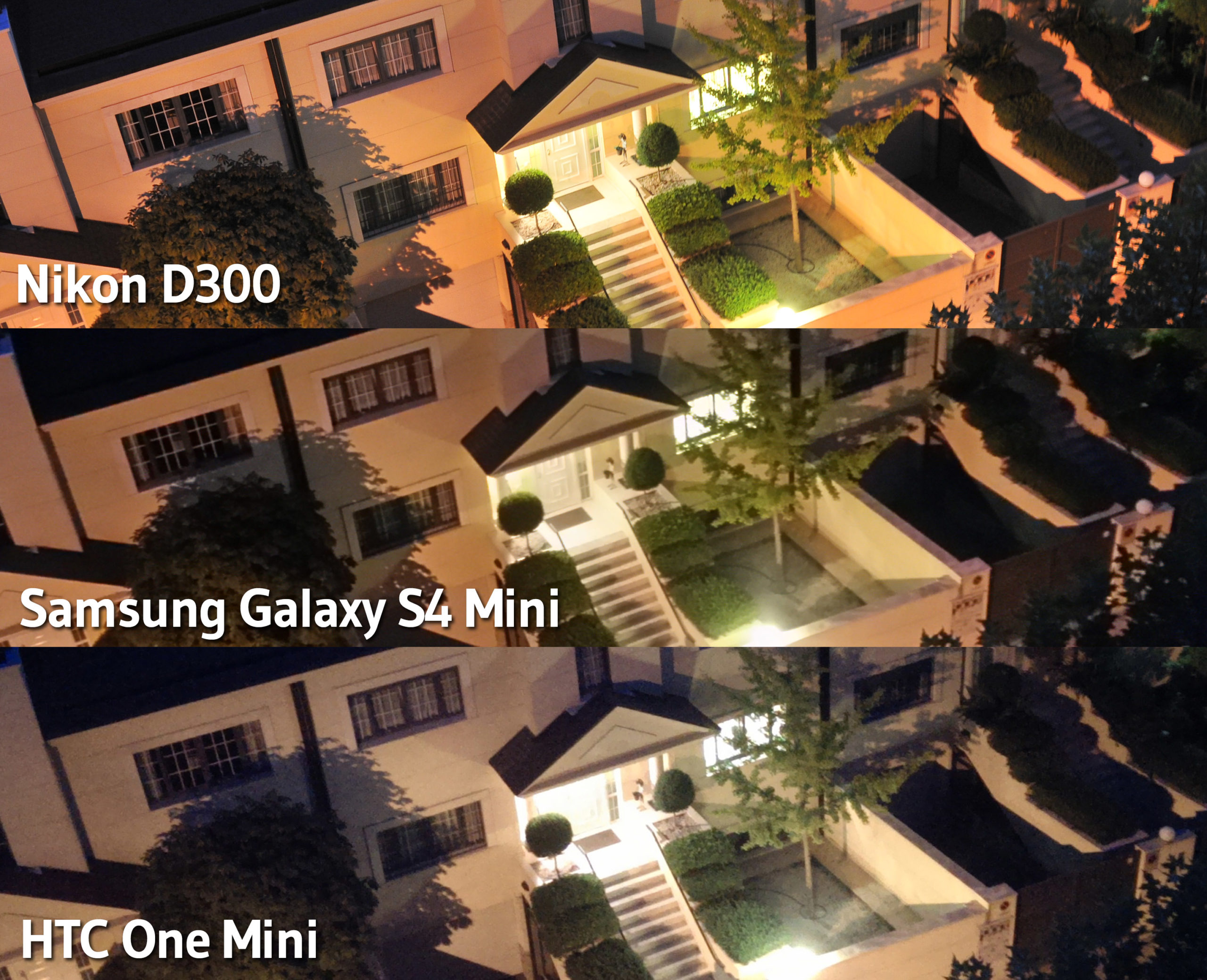 Ambas cámaras ofrecen un resultado bastante pobre en comparación con la cámara réflex, como era de esperar, pero la imagen captada por el Galaxy S4 Mini posee menos ruido, está menos quemada (la puerta no se aprecia bien en la imagen del HTC One Mini) y muestra colores más vivos.