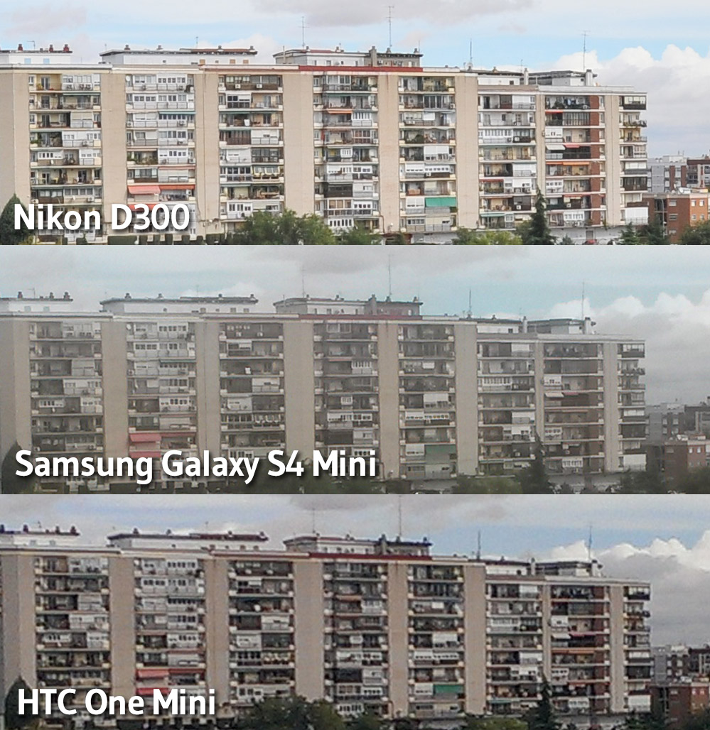 En la siguiente prueba comparamos la nitidez de los detalles captados por las cámaras de ambos móviles. Como es lógico, la mayor resolución del Galaxy S4 Mini le proporciona una ventaja sobre el HTC One Mini, que no es capaz de mostrar tanto detalle en las ventanas y terrazas de los edificios.