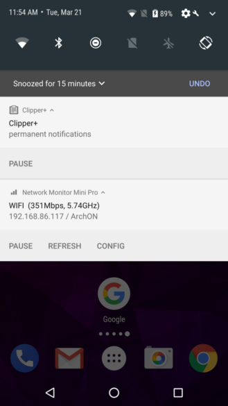 Dormir una notificación es posible con solo un poquito arrastrar la notificación hacia un lado. El icono aparece justo al lado del icono de ajustes que ya existe en Android. Lo pulsas y la notificación se dormirá durante 15 minutos. Si te has equivocado, hay un botón para deshacer.