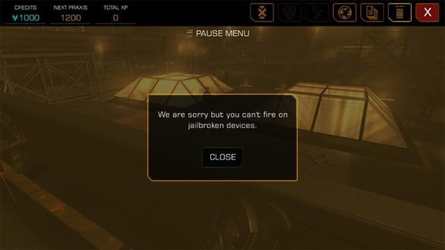 Desgraciadamente si tienes un dispositivo iOS con jailbreak y quieres jugar a Deus Ex: The Fall, te vas a encontrar con un «pequeño» problema. Aunque la aplicación puede ser descargada e instalada sin problemas, recibirás un mensaje de error al jugar como el de la imagen adjunta.