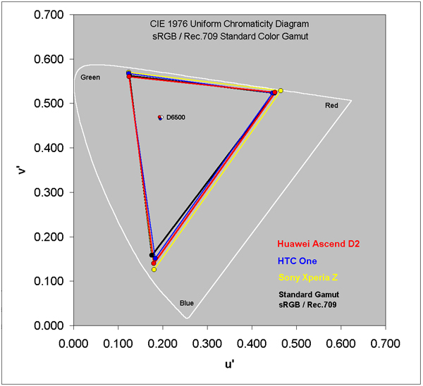 De acuerdo al análisis, la reproducción de colores del HTC One y del Huawei Ascend D2 es muy adecuada y ambos teléfonos tienden a mostrar los colores fielmente, mientras que el Sony Xperia Z suele producir colores menos fieles y más exagerados. Displaymate ha criticado la pobre calibración realizada por la tecnología Bravia Engine de Sony, y de hecho recomienda desactivar esta funcionalidad para mejorar la visualización. Tampoco les ha gustado la calibración de HTC ya que, en su opinión, realiza un procesado innecesario para que la pantalla del HTC One resulte más vistosa, dando lugar a colores demasiado saturados. A diferencia de Sony, HTC no da la opción de desactivar este procesado.