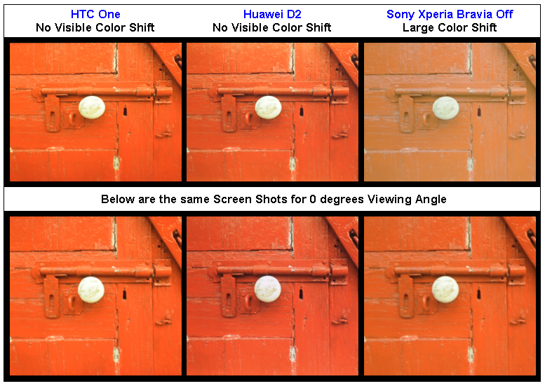Al igual que reflejamos en nuestro análisis del Sony Xperia Z, DisplayMate ha encontrado los ángulos de visión del Xperia Z bastante pobres, mientras que los del HTC One y Ascend D2 han resultado ser excelentes, si bien todos los paneles LCD sufren de degradación del brillo cuando se miran desde un ángulo.
