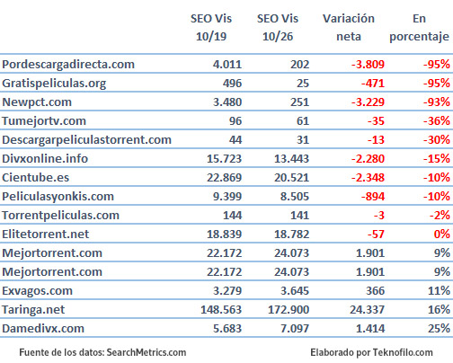 Como se puede apreciar, algunos sitios populares en español han reducido sustancialmente su visibilidad (por ejemplo, pordescargadirecta.com y newpct.com), mientras que otros no parecen haber sido afectados o incluso han incrementado su visibilidad en el buscador (por ejemplo, damedix.com).