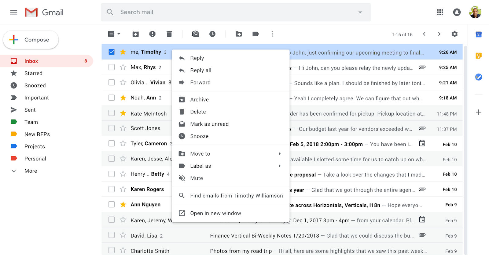 Como puedes ver en la imagen al final del artículo, un clic con el botón derecho del ratón en Gmail ofrecerá un montón de opciones, entre las que se incluyen Responder, Responder a todos, Reenviar, Mover a, Etiquetar y muchas más.