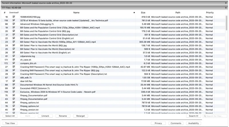 La filtración inicial es enorme, llegando a 43 GB, pero el torrent está lleno de archivos multimedia, la mayoría de los cuales son una colección de patentes de Microsoft.