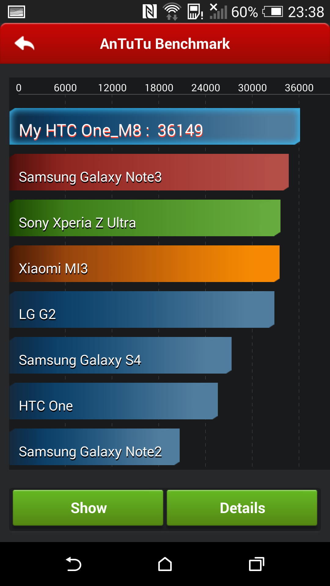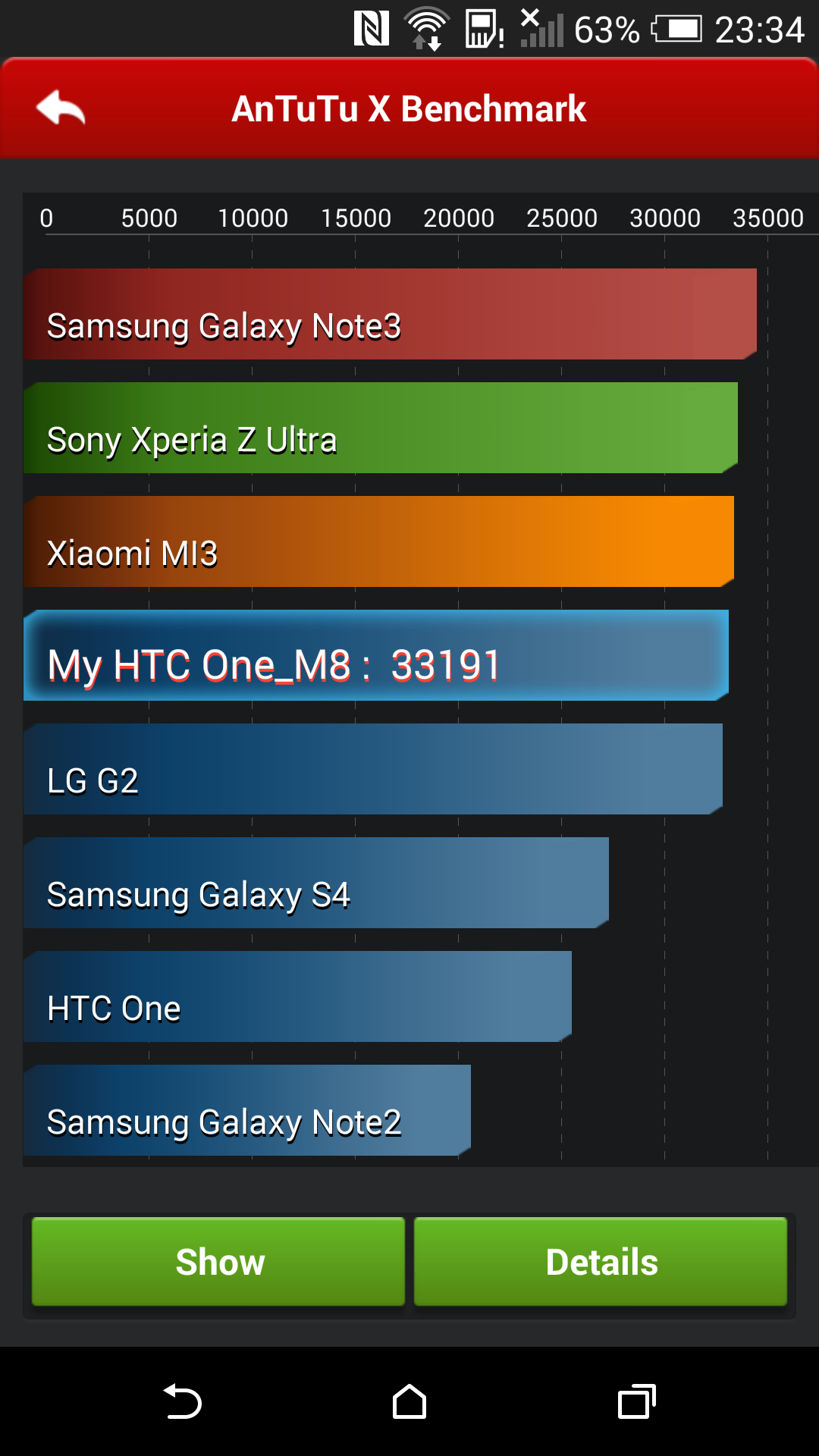 Nosotros mismos hecho la prueba y, efectivamente, los resultados de AnTuTu X (33.191 puntos) son inferiores a los de AnTuTu X (36.149) y, de hecho, en AnTuTu X el HTC One M8 queda por debajo del Sony Xperia Z Ultra o el Samsung Galaxy Note 3. Según hemos podido saber, el Samsung Galaxy S5 obtiene 33.357 puntos, el Sony Xperia Z2 consigue 32.508 puntos y el LG G Pro 2 se queda en 29.787 puntos.