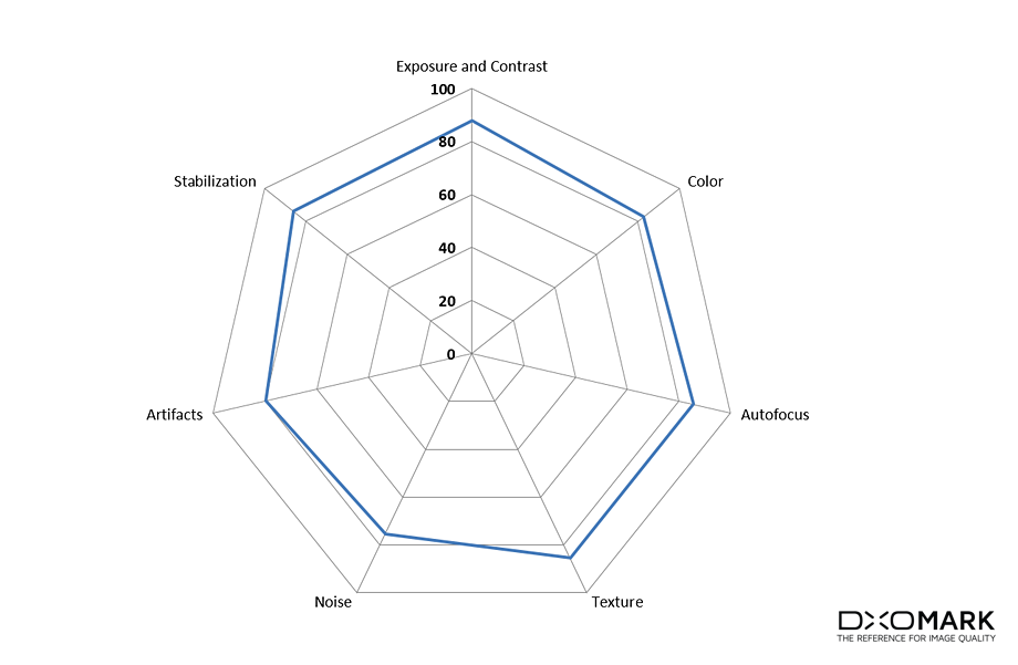 A la hora de grabar vídeo, la puntuación es 84. Los vídeos presentan una buena exposición con un buen rango dinámico y un balance de blancos preciso en todas las condiciones. Los vídeos presentan un buen nivel de detalle y mantienen las texturas. El enfoque a la hora de grabar vídeo también es muy bueno, con una reacción muy rápida al cambiar de escena.
