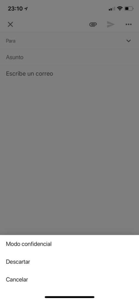Si deseas utilizar el modo confidencial, basta con comenzar a escribir un correo electrónico. A continuación, pulsa sobre el menú de tres puntos situado en la parte superior derecha de la pantalla, que mostrará una opción de «modo confidencial». Pulsa sobre ella y tendrás opciones para establecer una contraseña para el correo electrónico y una fecha de caducidad.