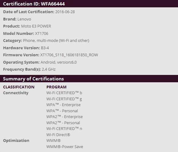 Una publicación en la web de la Wi-Fi Alliance confirma que un smartphone llamado el Moto E3 Power ha obtenido la certificación WiFi. Según dicha web, llegará con número de modelo XT1706 y correrá Android 6.0 Marshmallow.