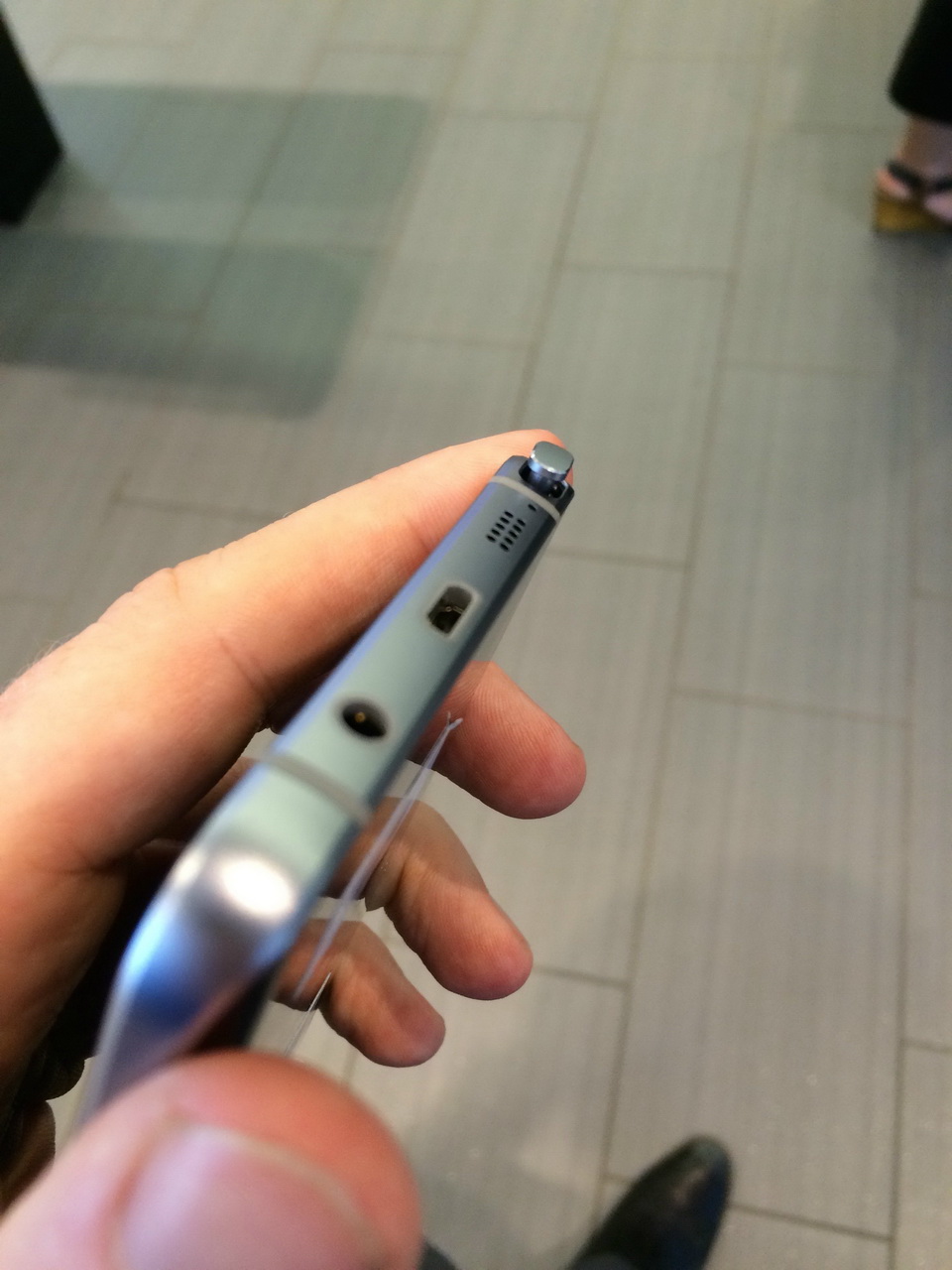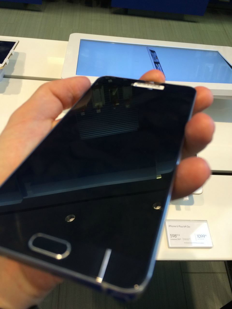 En estas nuevas imágenes podemos verlo junto a un iPhone 6 Plus. Llama la atención que, a pesar de tener una pantalla de 5,7″, el tamaño del teléfono de Samsung sea inferior al de Apple.