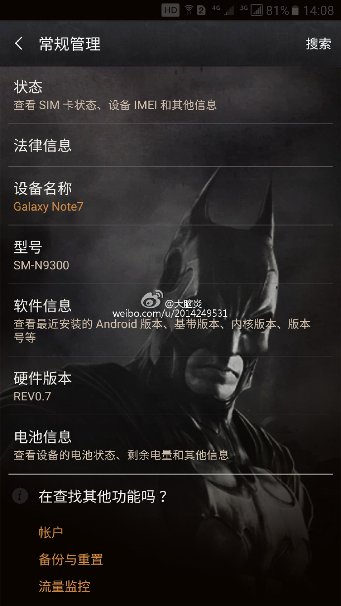 Ahora parece que Samsung planea repetir con el Galaxy Note 7 ya que han aparecido imágenes en Weibo en las que podemos ver el signo de Batman. La combinación de colores parece ser la misma que en el Galaxy S7 edge: color negro, detalles dorados y software inspirado en Batman.